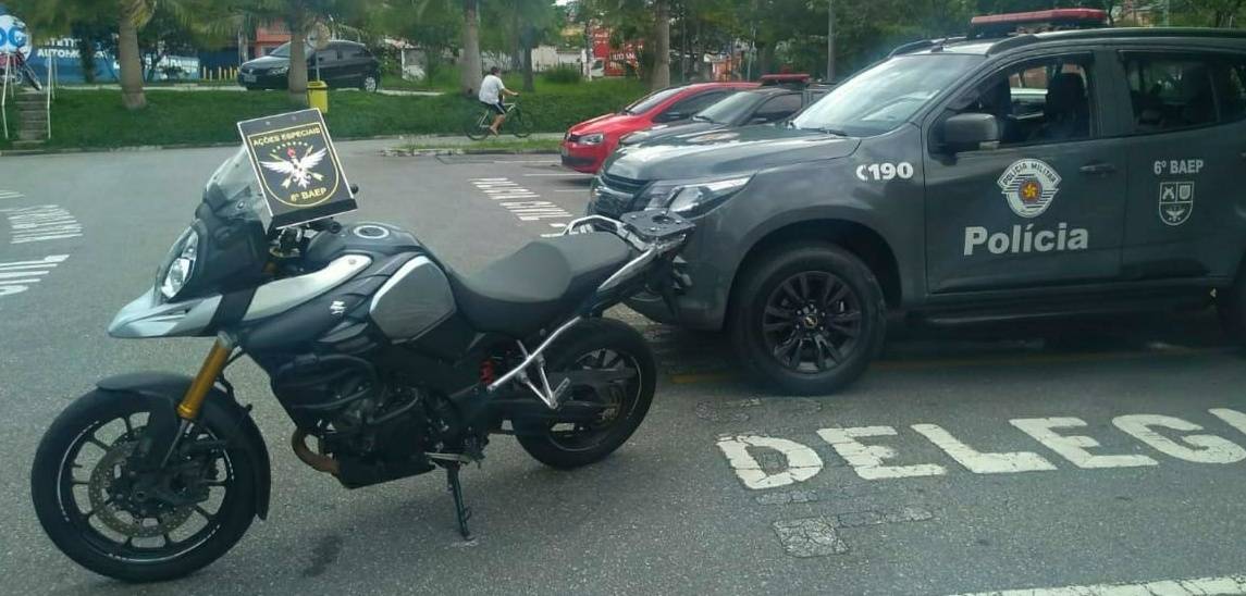 Em busca pessoal foi encontrado no bolso da bermuda do mesmo uma chave de motocicleta e uma chave de um veículo. Ao ser questionado, o indivíduo informou que a chave era de uma motocicleta que estava na garagem. Ao verificar a motocicleta a mesma não possuía placa, sendo feita a pesquisa do chassi via COPOM onde foi constatado que a motocicleta Suzuki/VSTROM era produto de furto.