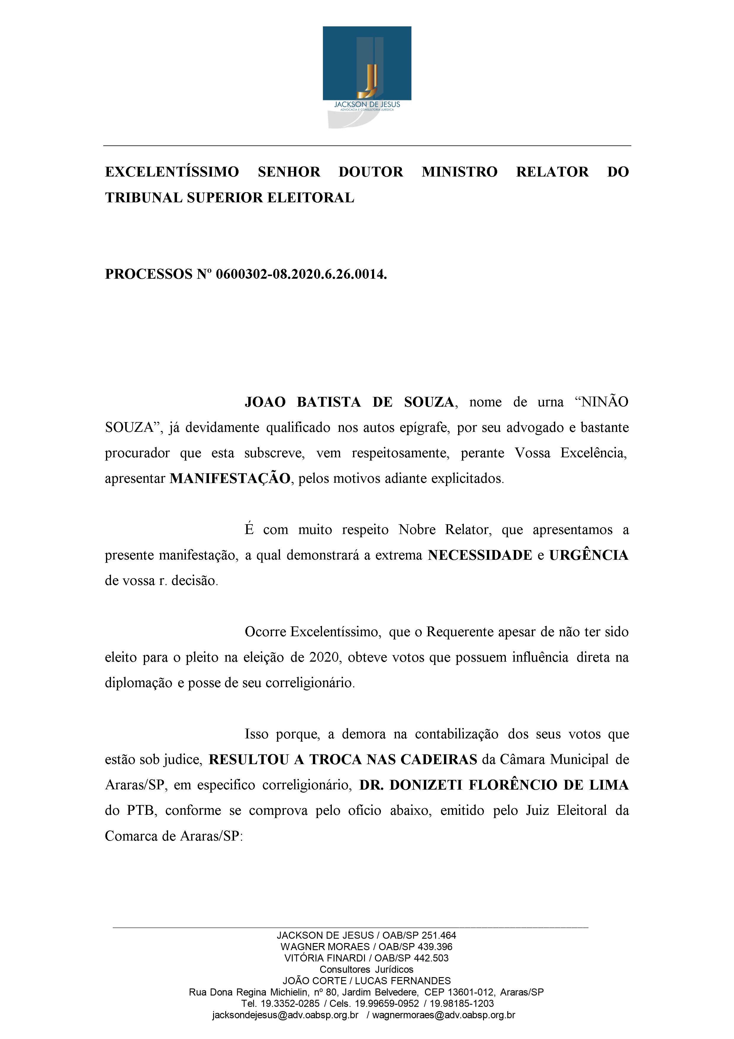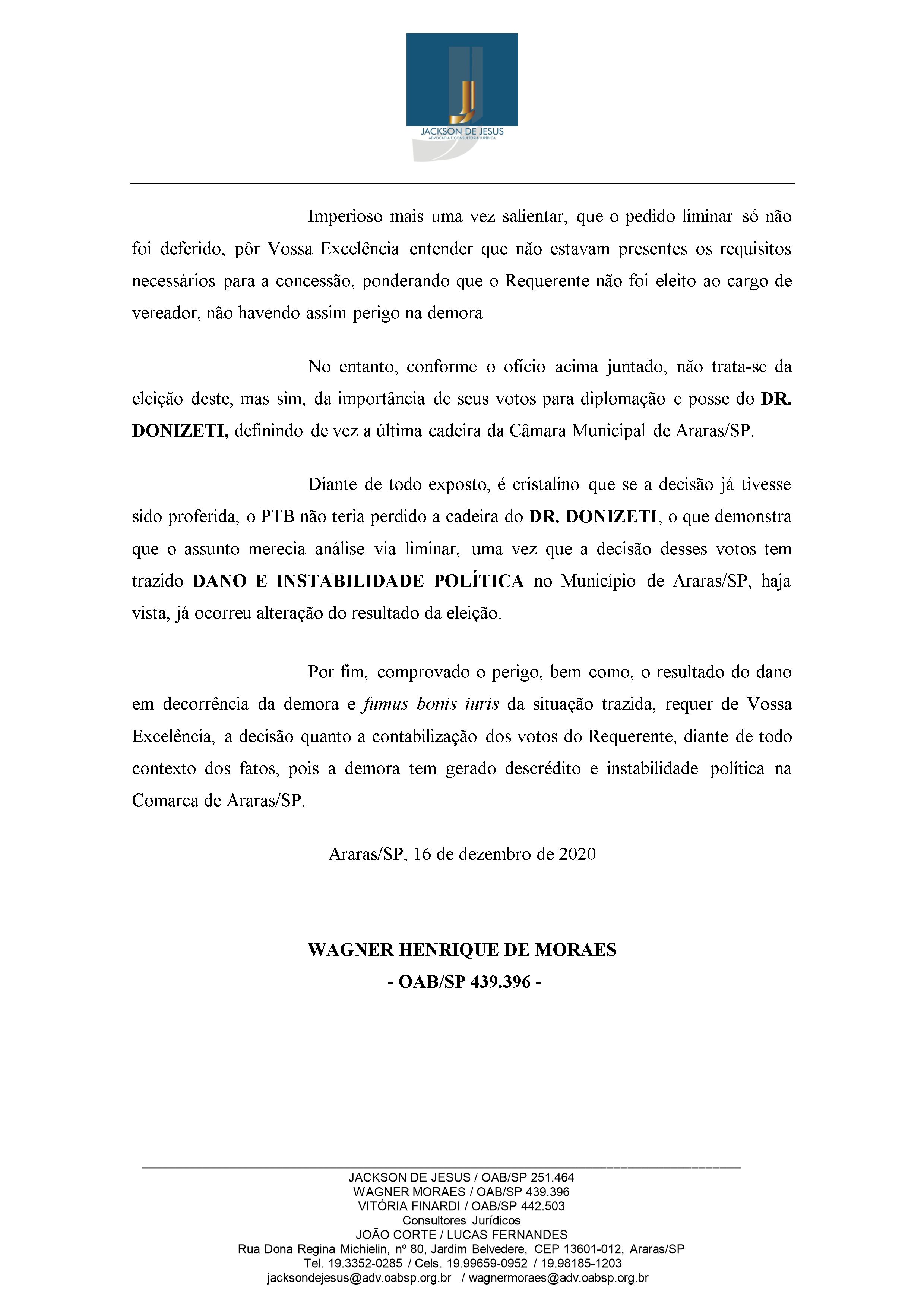 Por conta disso, os advogados do médico Dr. Donizetti Florêncio (PTB), protocolaram na manhã desta quarta-feira (16), um pedido de liminar pedindo nova recontagem dos votos junto ao TRIBUNAL SUPERIOR ELEITORAL, e aguardam ansiosos a decisão. Veja abaixo: