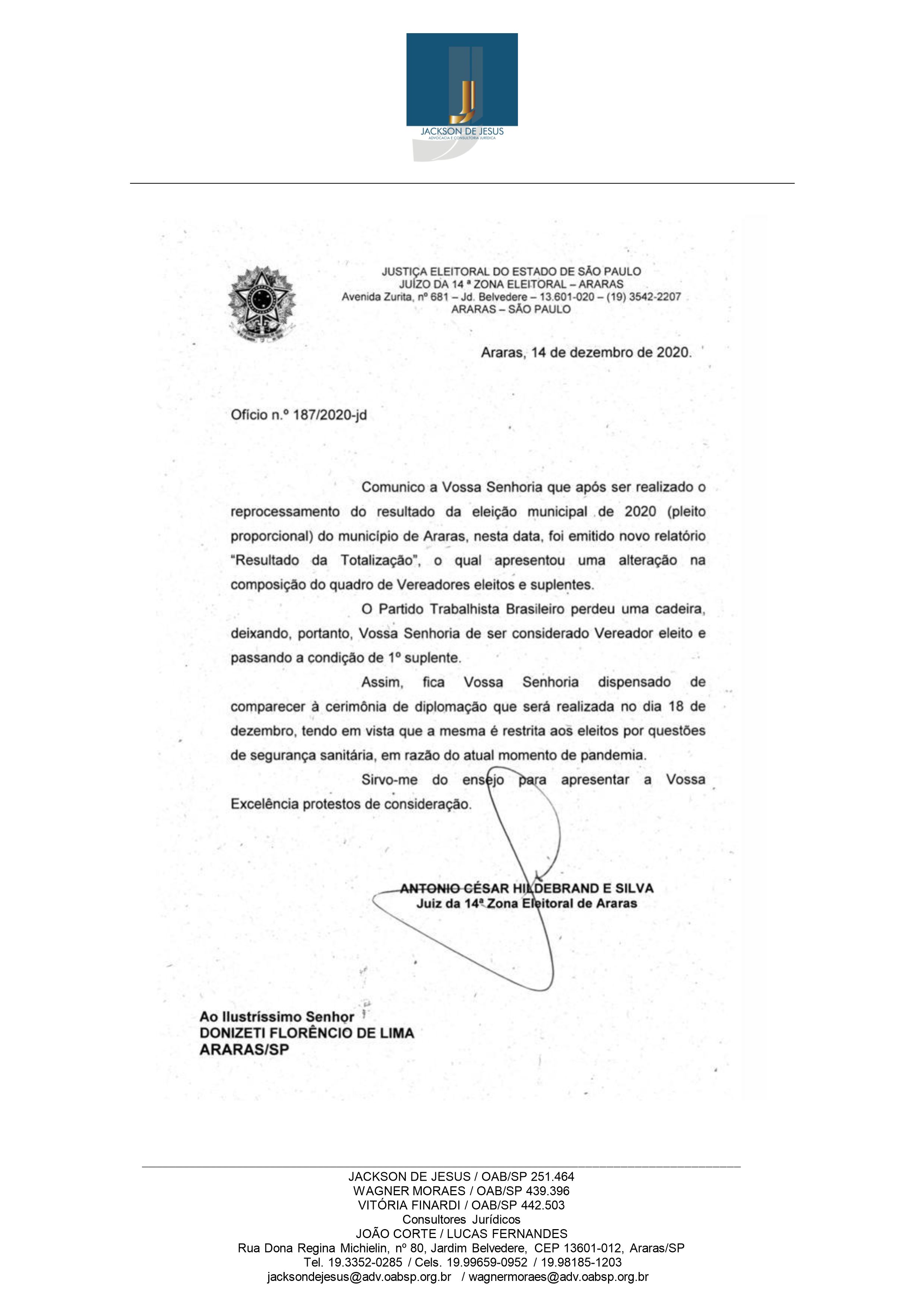 Uma nova totalização de votos realizada pelo Cartório Eleitoral da 14ª Zona Eleitoral de Araras (SP), realizada na segunda-feira, dia 14 de dezembro, alterou a lista de vereadores eleitos para a 18ª legislatura de Araras, que compreende o período de 2021 a 2024. Ao final da contagem dos votos de alguns candidatos que estavam sub judice, ficou definido que o PSD ficou à frente do DEM, que por sua vez, superou o PTB no número de votos para o partido.