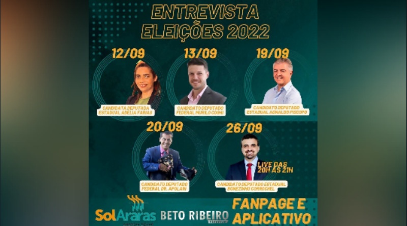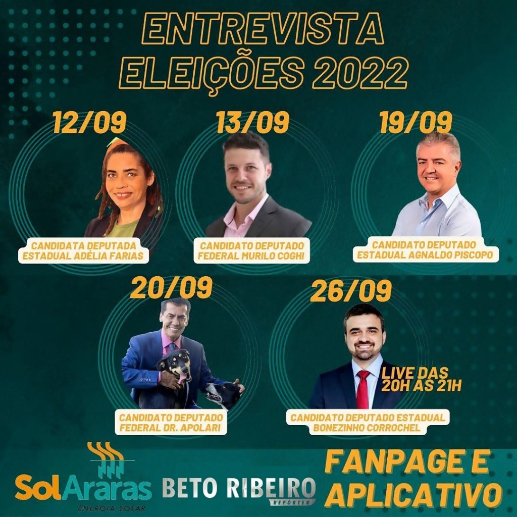 A rede de comunicação Repórter Beto Ribeiro, composta pelos portais de notícias Repórter Beto Ribeiro, Notícia 360, Rádio Vem Com A Gente, Fatos Policiais e Gera Conteúdo, realiza, a partir de segunda-feira (12), com apoio de SolAraras – Energia Solar, o ciclo de entrevistas com candidatos a deputado federal e estadual pela cidade de Araras (SP).