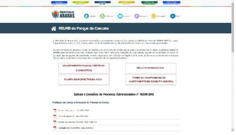 Para acessá-las, basta entrar no site da Prefeitura – www.araras.sp.gov.br – e clicar no link “Reurb do Parque da Cascata”, disponível na seção “Principais Serviços de Utilidade Pública da Prefeitura”. Lá, o internauta encontra informações sobre o levantamento planialtimétrico e cadastral, planta do perímetro da área, projeto urbanístico e termo de ajustamento de conduta judicial, firmado com o Ministério Público, que acompanha todas as etapas do processo. Além disso, é possível acompanhar ainda decisões, editais, prestação de contas, legislações e notícias.