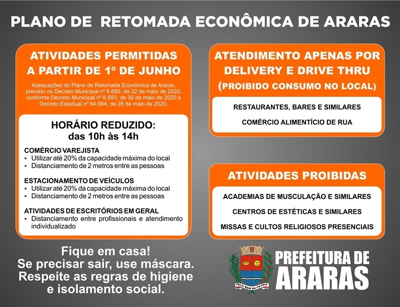 Comércio varejista, escritórios, prestadores de serviço e concessionárias passam a funcionar a partir desta segunda-feira, dia 1° de junho em Araras (SP), junto a demais segmentos considerados essenciais que já estão em atividade desde o início da pandemia do novo coronavírus, causador da covid-19.