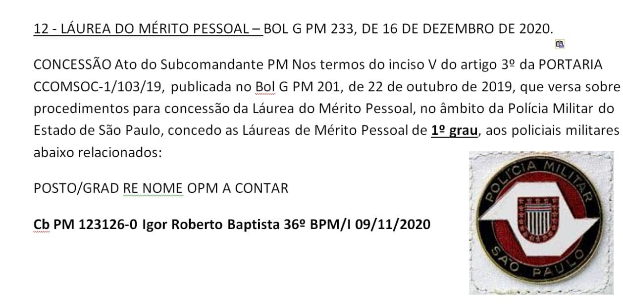 O cabo da Polícia Militar do Estado de São Paulo (PMESP), Igor Roberto Batista “Robertinho”, que integra o efetivo da ROCAM (Ronda Ostensiva com Apoio de Motocicletas) da 2ª Cia da PM de Araras (SP), foi homenageado com a Láurea do Mérito Pessoal em 1º Grau, conferida pela corporação.