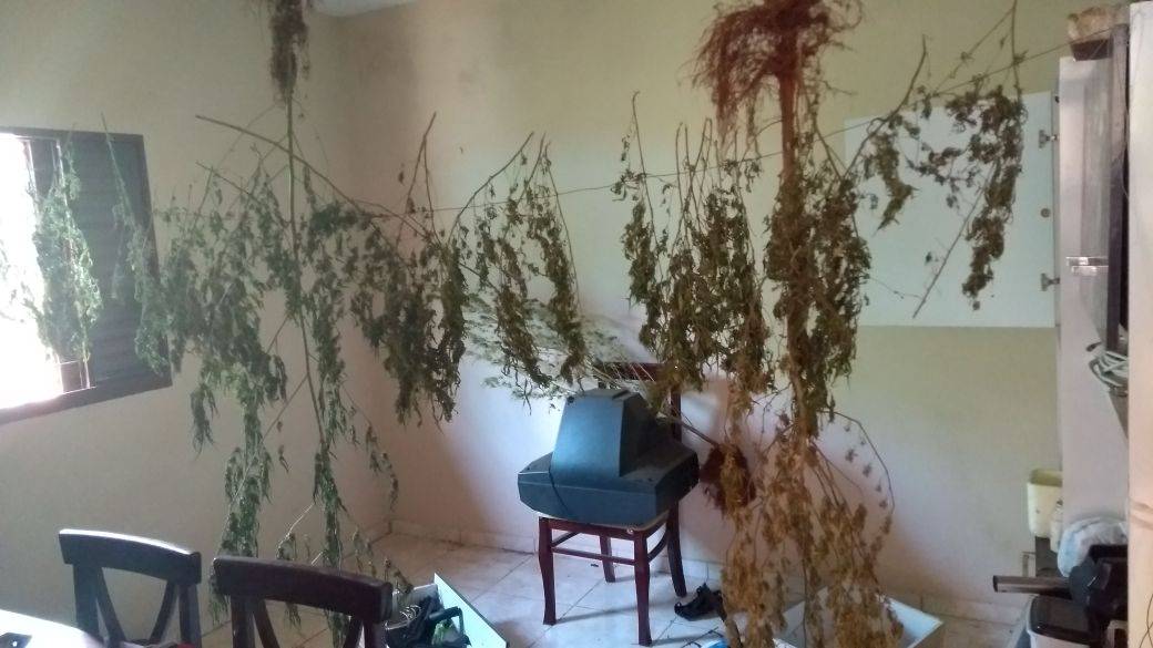 Durante a busca no local além da plantação da maconha foi encontrada em um quarto dos fundos mais pés da mesma droga que estavam secando em um varal que era usado para secagem e o embalo da droga