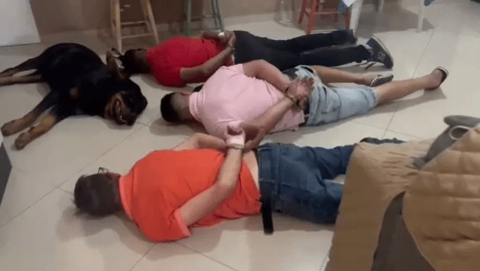Um cachorro da raça Rottweiler “se rendeu” junto com três suspeitos presos durante uma operação da Delegacia de Investigações sobre Entorpecentes (Dise) de Americana (SP) na tarde desta quinta-feira (28). O trio foi detido com um carregamento de 1,1 tonelada de maconha em uma chácara do bairro Vila Real, em Hortolândia (SP).Um vídeo gravado pelos policiais mostra o cão e os homens deitados enquanto a equipe revista o imóvel.