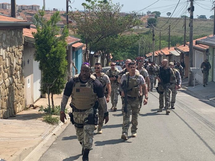 A PM e a Guarda Municipal interceptaram a quadrilha durante a fuga e houve troca de tiros. Três viaturas da Guarda Municipal e uma da PM foram alvejadas. Um policial militar foi baleado na perna. Segundo a PM, o Grupo de Ações Táticas Especiais (Gate) foi chamando.