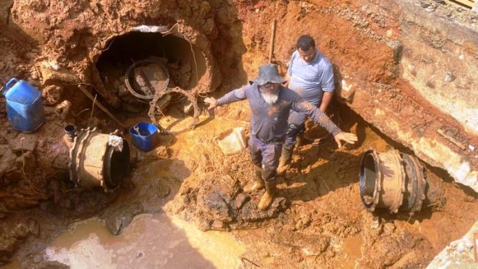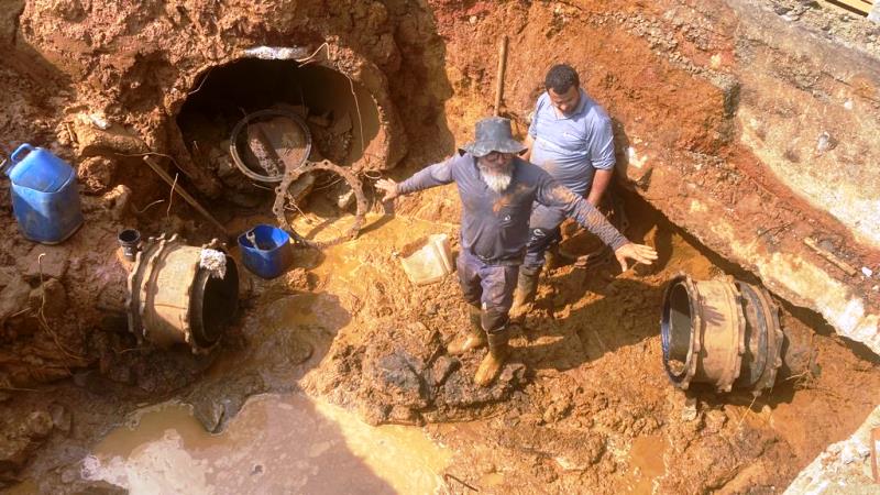 Servidores do Saema trabalharam durante a madrugada e o inicio do dia de hoje na operação de grande complexidade no local para impedir que o vazamento continuasse.