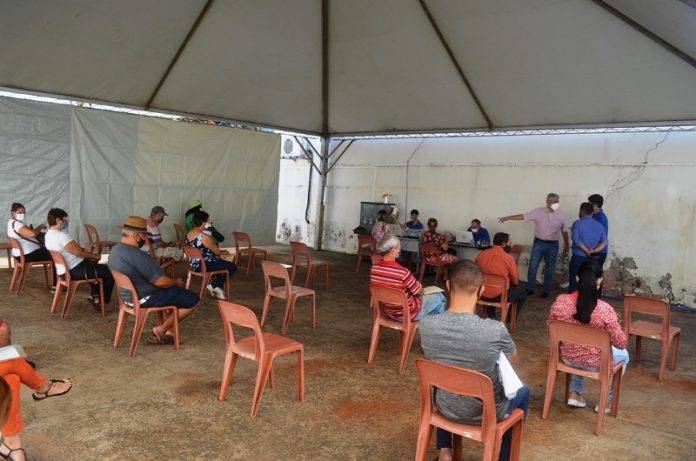Tenda montada no estacionamento da central de atendimento no Centro aumenta capacidade de atendimento e oferece cadeiras e bebedouro.