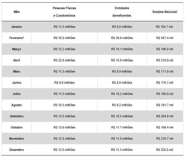 A Secretaria da Fazenda e Planejamento do Estado disponibilizou R$ 23.570.849,84 aos participantes da Nota Fiscal Paulista na liberação de créditos do mês de dezembro. Desse montante, R$ 12 milhões foram destinados para pessoas físicas e condomínios. Já as instituições filantrópicas têm à disposição R$ 11,3 milhões para utilização nos projetos.