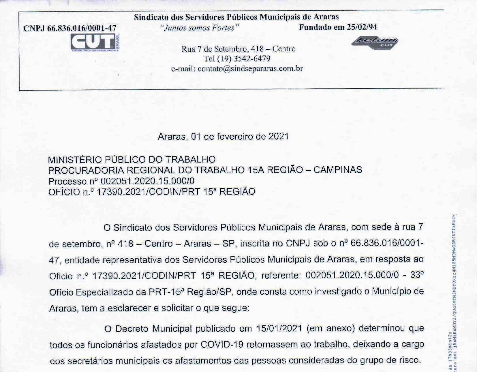 O SINDSEPA – Sindicato dos Servidores Públicos Municipais de Araras (SP), protocolizou junto ao Ministério Público do Trabalho, informações acerca do Decreto Municipal datado de 15/01/2021, o qual determina a volta dos servidores públicos ao trabalho, sem considerar as pessoas do grupo de risco, trazendo enormes riscos a saúde dos trabalhadores e de nossa população em geral. A informação foi divulgada no site oficial do sindicato: www.sindsepararas.org.br.