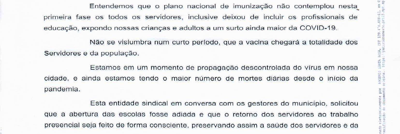 Ainda de acordo com a publicação, a decisão da volta ao trabalho não deve ser pautada por uma decisão de governo, pois estamos tratando de vidas e somente com avaliação médica criteriosa os servidores terão segurança para exercer suas funções com a dedicação que nossa população merece.
