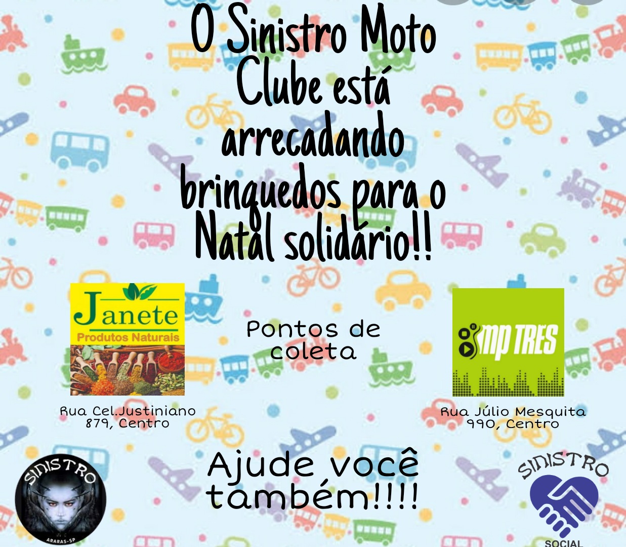O Sinistro Moto Clube está mais uma vez arrecadando brinquedos para realização de mais uma edição do “Natal Solidário” na cidade de Araras (SP). De acordo com os organizadores, nesse momento o grupo está dando preferência para arrecadação brinquedos masculinos, pois já foram arrecadados uma boa quantidade de brinquedos femininos, mas toda a doação será bem vinda.