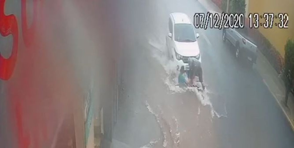 Imagens de câmeras de segurança mostram quando Rosineia, cai, é levada pela água e bate contra um carro. Ao ver a auxiliar em apuros, o comerciante Manoel Messias da Silva deixou a loja dele e correu para tentar ajudá-la. O vídeo mostra o idoso segurando e puxando Rosineia para fora da água. Após salvá-la, ele ainda volta para tirar a bicicleta da auxiliar.