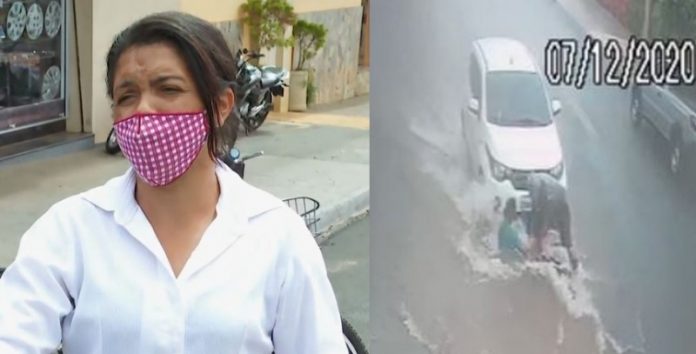 “Eu só pensei em salvar ela. Eu não sei como é que eu consegui, foi difícil. Eu peguei ela pelos dois braços dela e joguei ela pra dentro da loja. Aí voltei pra buscar a bicicleta dela que ficou na frente do carro. Eu só pensava em salvar ela.”