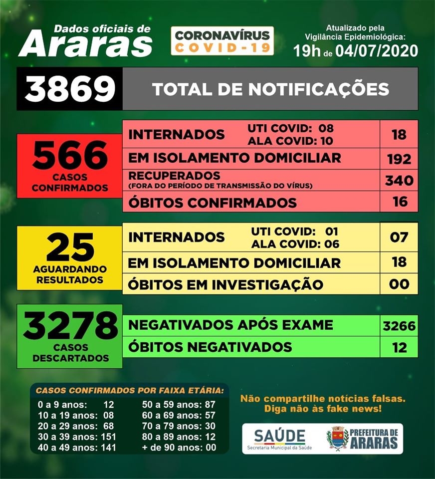 Segundo o último balanço da Secretaria, Araras registra 566 casos confirmados da doença provocada pelo novo coronavírus (Sars-CoV-2).