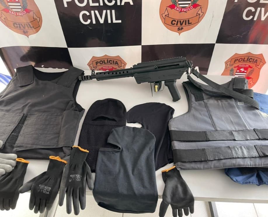 Diante da informação, os policiais civis foram até o local e foram recebidos pela mulher, que autorizou a entrada da equipe para buscas. Como resultado, a arma de fogo, três coletes balísticos, três máscaras balaclavas e três pares de luvas foram encontrados no porta-malas de um veículo que estava na garagem. Todo o material foi apreendido para perícia e o carro recolhido.