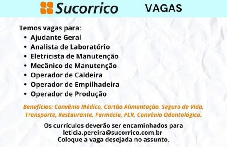 A empresa Sucorrico – Unidade de Araras (SP), está com vagas de emprego disponíveis para ajudante geral, analista de laboratório, eletricista de manutenção, mecânico de manutenção, operador de caldeira, operador de empilhadeira e operador de produção.