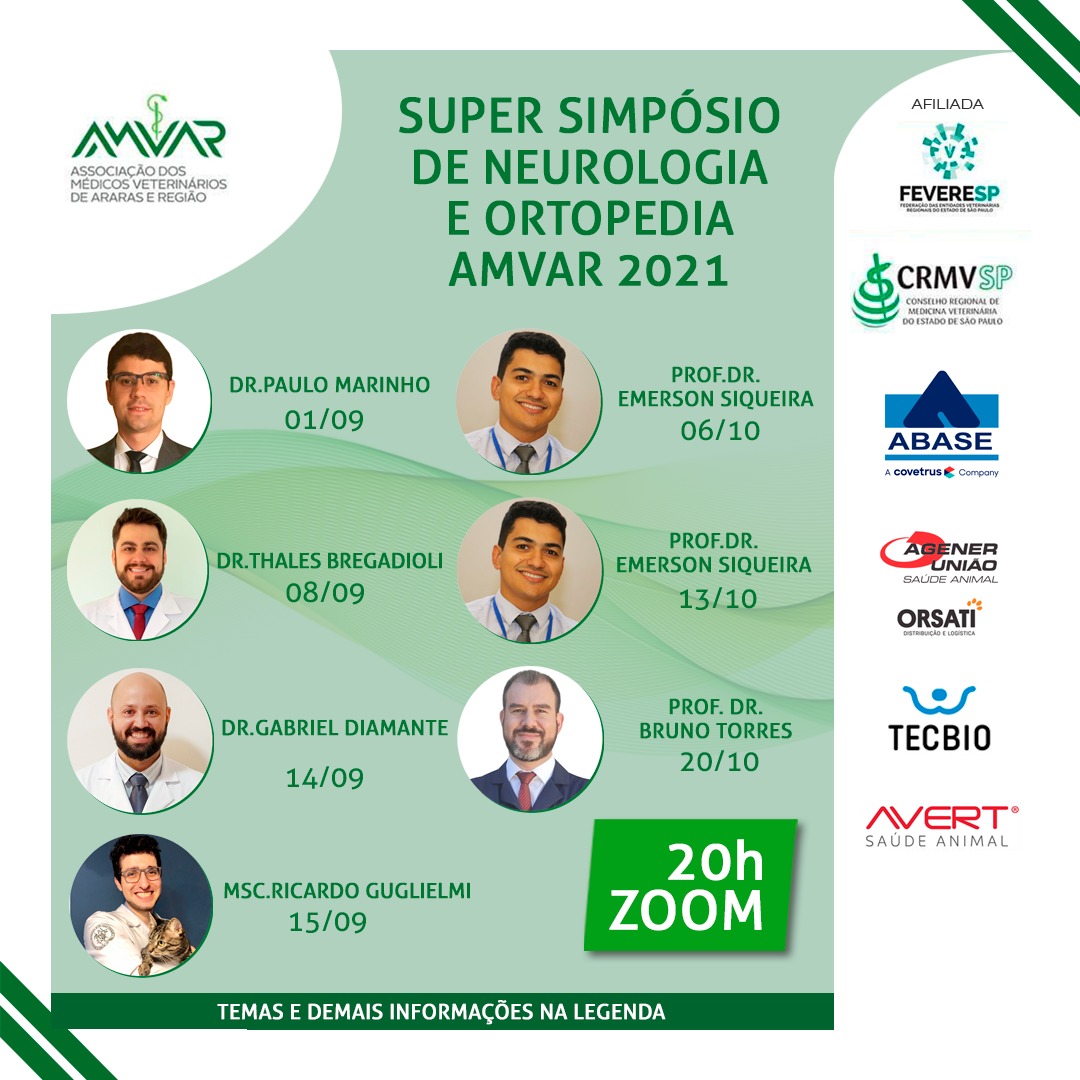 A participação de sócios da AMVAR, FEVERESP e da ABHV é gratuita. O link de acesso será liberado aos inscritos a partir das 19h45. O evento conta com o apoio da Conselho Regional de Medicina Veterinária e ABHV, além dos laboratórios e distribuidores Abase, Agener, Orsati, Avert e Tecbio. Mais informações: (19) 99785-2577.