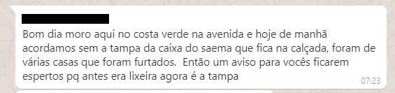 Na manhã desta terça-feira (9), alguns moradores do bairro Costa Verde, localizado na região leste da cidade de Araras (SP), ao acordarem notaram que durante a madrugada havíam furtado tampas da caixa do hidrômetro que ficam na calçada.