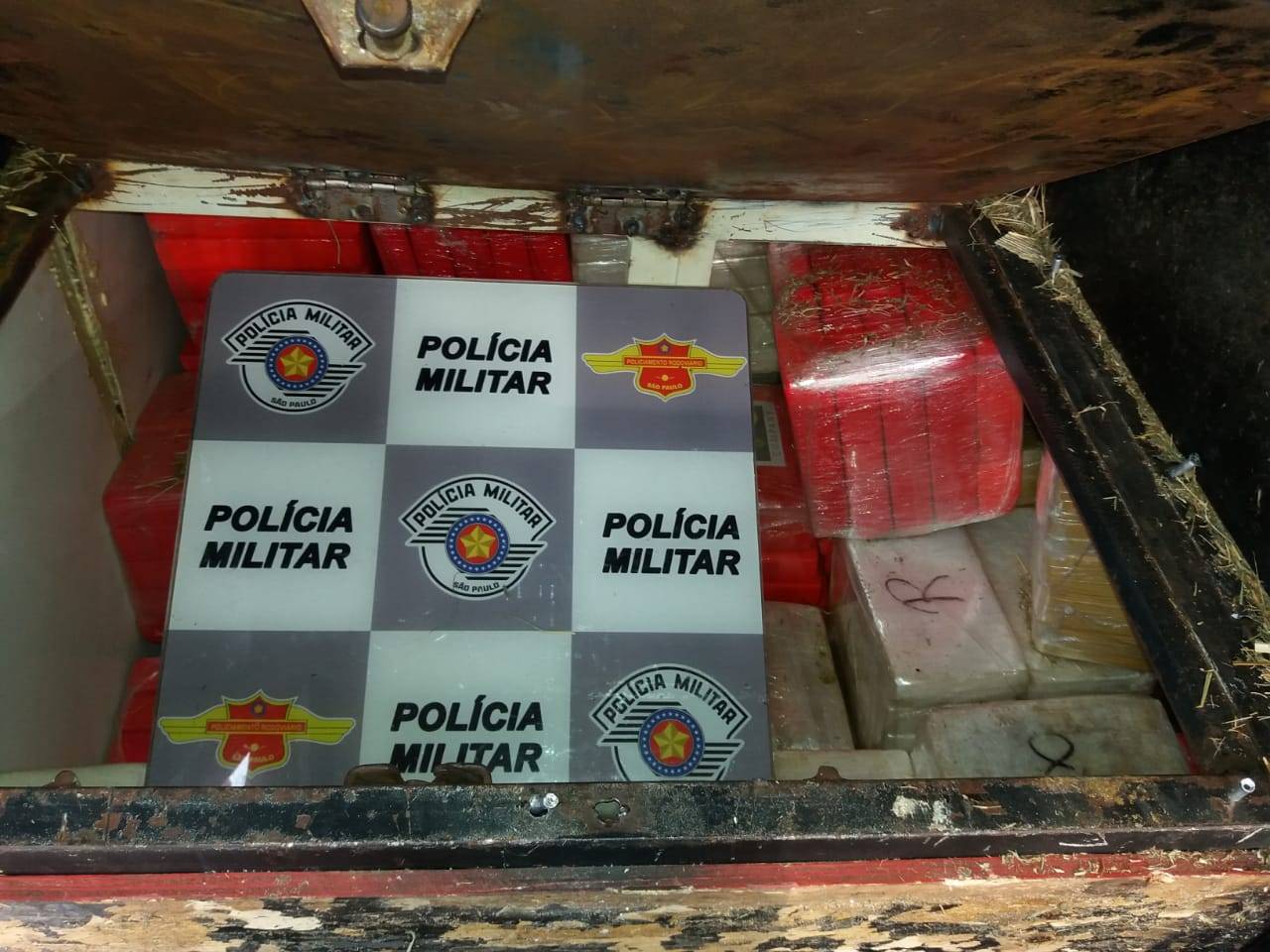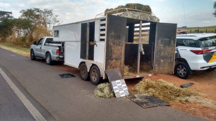 Tanto as drogas quando a arma estavam em um fundo falso de um trailer para transporte de cavalos, que estava atrelado à uma caminhonete.