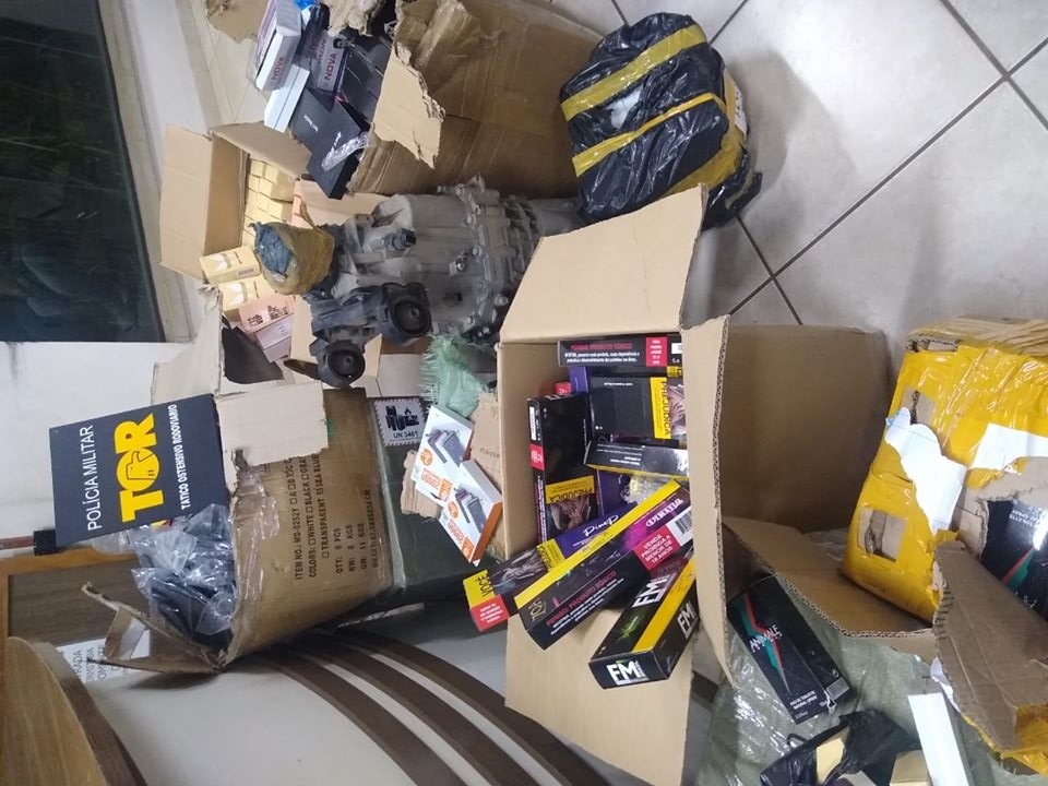 Com o apoio de mais uma equipe TOR, foram localizados, frascos de perfume tipo falsificados, diversos eletrônicos, smartwatch, celulares, capas e películas, carregadores, acessórios para Narguilé, pacotes de tabaco e uma caixa de câmbio de ônibus sem identificação.