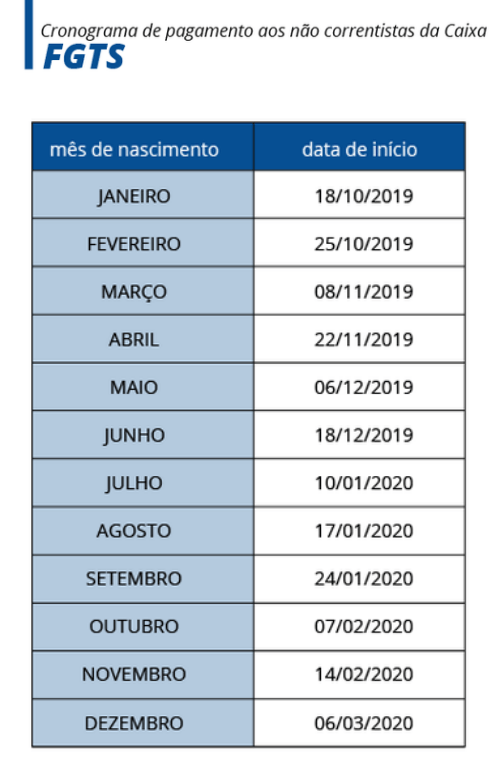 A Caixa Econômica Federal inicia, em setembro, o pagamento de até R$ 500 por conta do Fundo de Garantia do Tempo de Serviço (FGTS). Os repasses serão feitos até 31 de março de 2020, conforme a data de nascimento dos beneficiários.