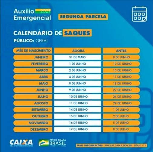 Os trabalhadores informais e inscritos no Cadastro Único para Programas Sociais do Governo Federal (CadÚnico) nascidos em julho já podem sacar a segunda parcela do auxílio emergencial 2021. O dinheiro foi depositado nas contas poupança digitais da Caixa Econômica Federal em 29 de junho. A terceira parcela poderá ser sacada a partir de 27 de julho e a quarta, a partir de 27 de agosto.