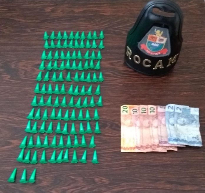 Durante patrulhamento pelo bairro Parque Tiradentes, os ROCANIANOS avistaram um indivíduo parado no cruzamento da rua Olivério Morgado com a rua Laerte Tognasca e o mesmo ao ver as viaturas jogou um envolucro plástico no chão e começou a correr, sendo abordado logo em seguida. Na revista pessoal foi encontrado no seu bolso a quantia de R$ 62,25 reais.