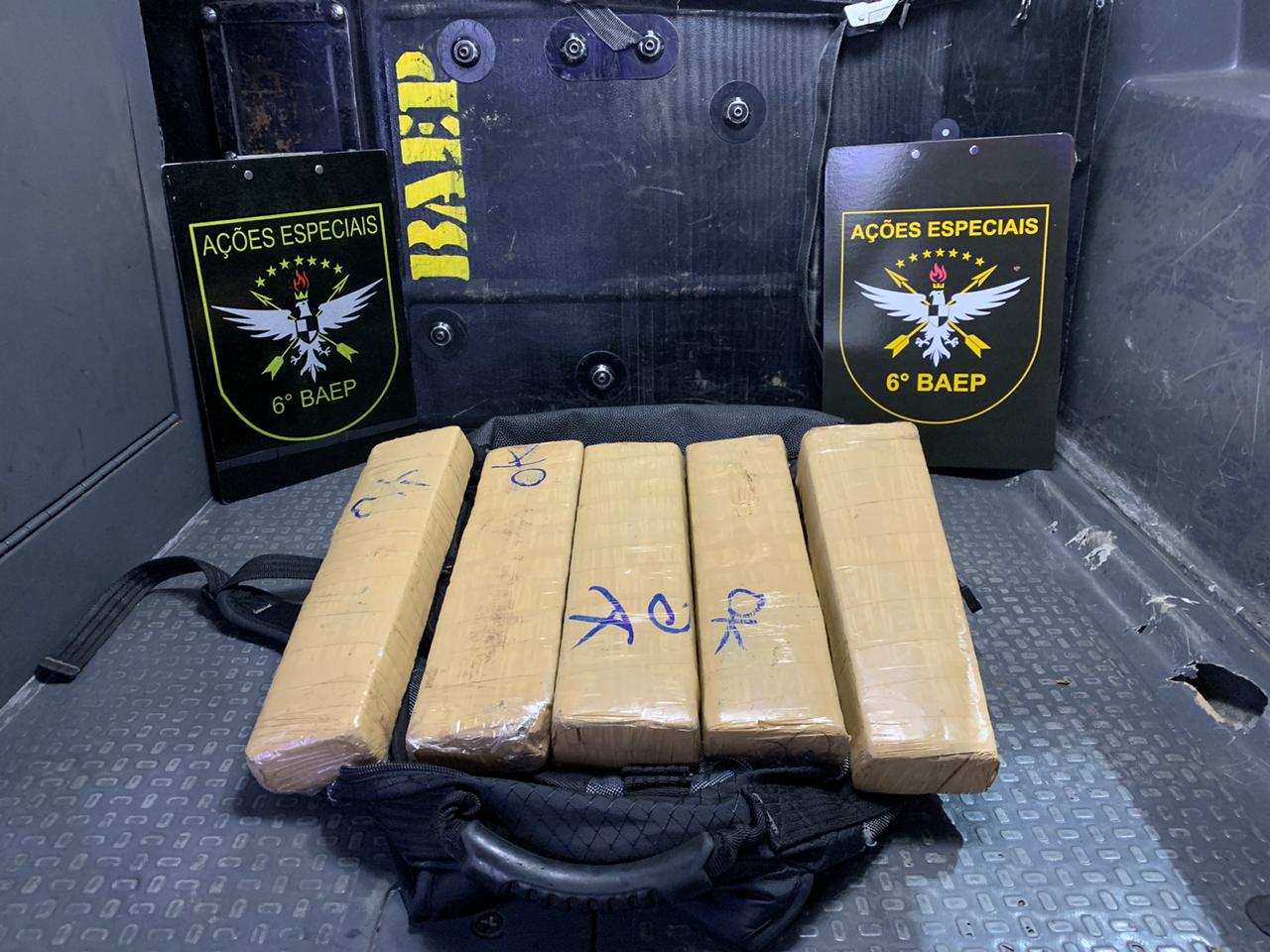 Ao visualizar a aproximação policial o indivíduo empreendeu fuga desvencilhando-se da mochila. Em ato contínuo a equipe prosseguiram no indivíduo, sendo que o comandante da equipe localizou a bolsa e constatou que no seu interior havia 05 tijolos de substância entorpecente aparentando ser Maconha e o indivíduo detido.