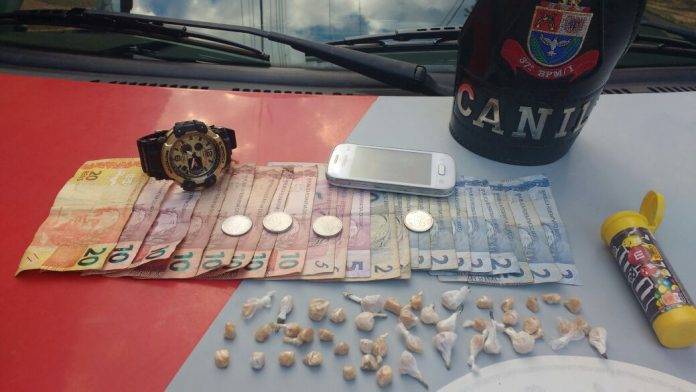 Realizada a abordagem e com um deles foi localizado a quantia de R$ 133,00 em notas diversas. Em varredura com o apoio do cão de faro Avallon em um terreno abandonado em frente a abordagem foi localizado em meio a um arbusto um tubo plástico contendo 44 pedras de crack. Ocorrência apresentada pela viatura de Brotas (SP).