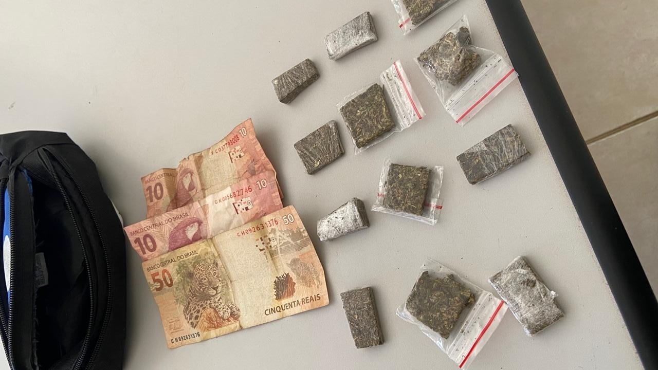 Em revista pessoal foi localizado no interior da pochete 12 buchas de maconha e uma importância de R$ 70,00 reais em notas trocadas.