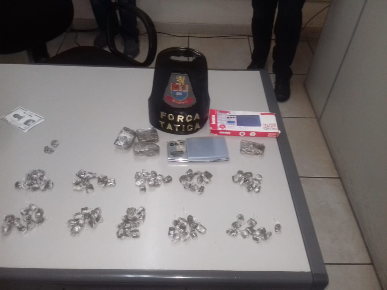 Diante da informação, com apoio dos policiais militares cabo Roberto e soldado Jordano (ROCAM), as equipes se deslocaram até sua casa onde com autorização de seu irmão, adentraram o imóvel, e encontraram em seu quarto, na gaveta de uma cômoda, 102 porções de maconha pronta para venda, quatro pequenos tijolos de maconha, além de uma balança de precisão.