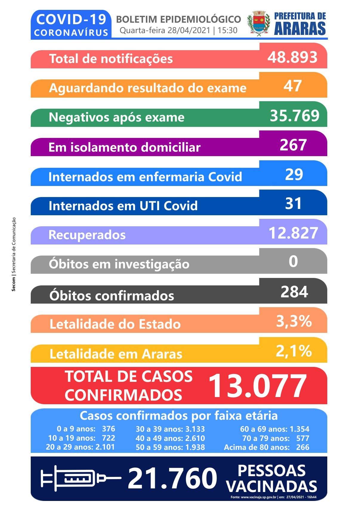 Dados Oficiais, atualizados pela Vigilância Epidemiológica na tarde desta quarta-feira (28), confirmaram mais três mortes, totalizando 284 óbitos em decorrência da Covid-19 em Araras (SP). Os dados sobre o paciente não foram divulgados.
