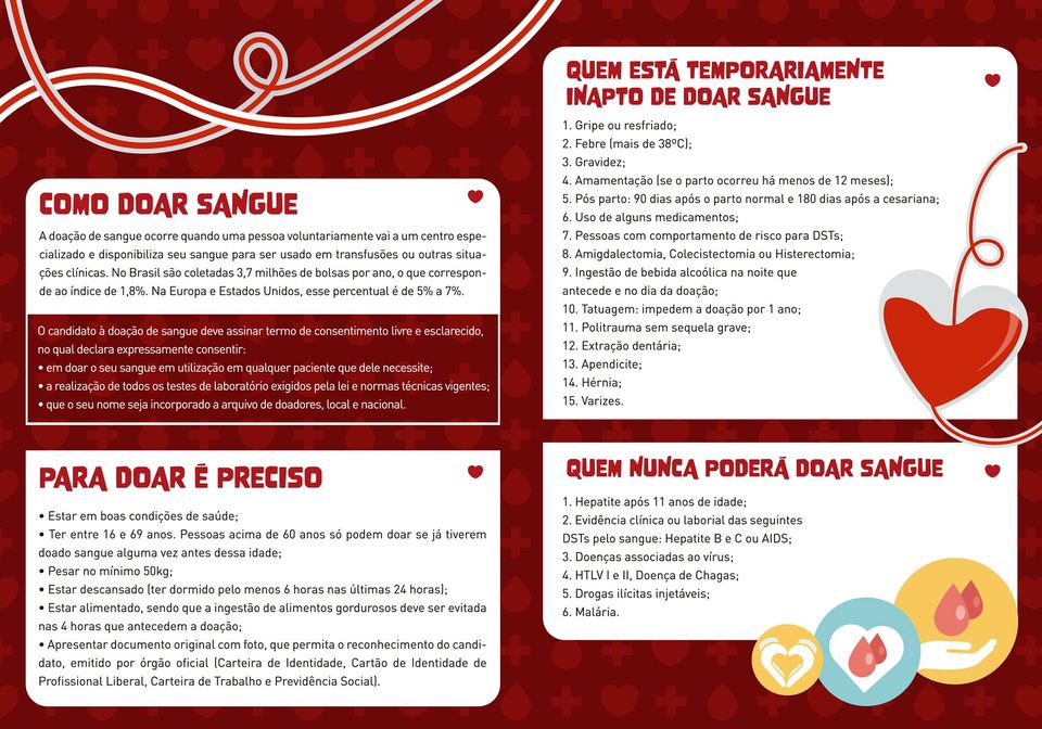 Uma única doação pode salvar até quatro vidas e o procedimento é simples, rápido e seguro. Não há riscos para doador, pois nenhum material utilizado na coleta do sangue é reutilizado, o que elimina a possibilidade de contaminação.