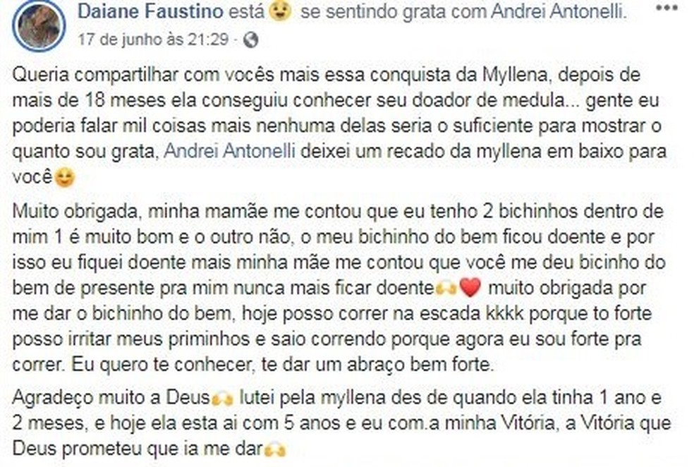 Após a conversa por videochamada, Daiane publicou em sua conta em uma rede social um agradecimento feito por Myllena: