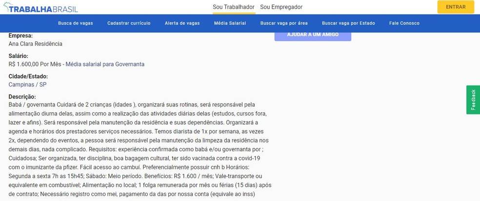 Na descrição do trabalho, os empregadores informam que a pessoa contratada teria que cuidar da alimentação diurna e das atividades diárias, como estudos, cursos e lazer, de duas crianças cujas idades não foram informadas.