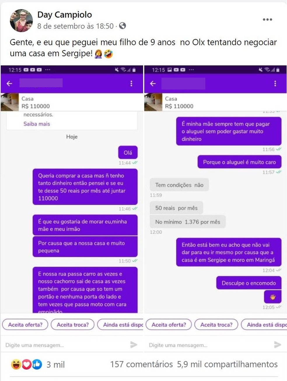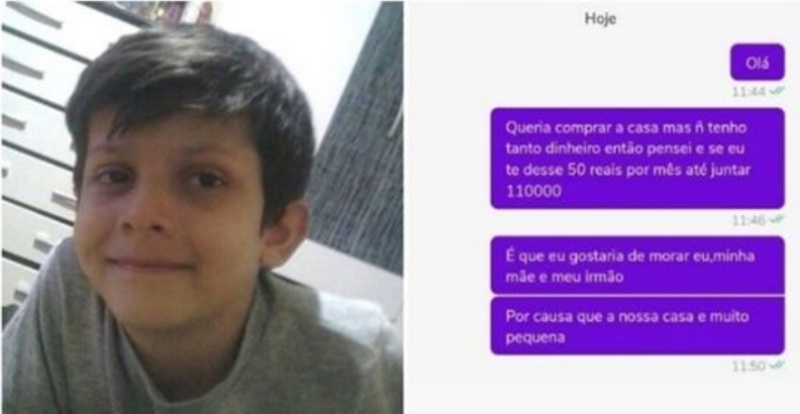 A história de João Bernardo, de nove anos, viralizou nas redes sociais após a mãe dele, Daiana Campiolo, compartilhar mensagens em que o garoto negociava a compra de casa de R$ 110 mil em Sergipe por um aplicativo de celular.