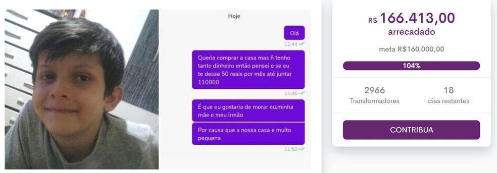 Uma vaquinha feita pela internet arrecadou mais de R$ 160 mil para o garoto de Maringá, no norte do Paraná, que tentou comprar uma casa para a família dele com parcelas mensais de R$ 50.