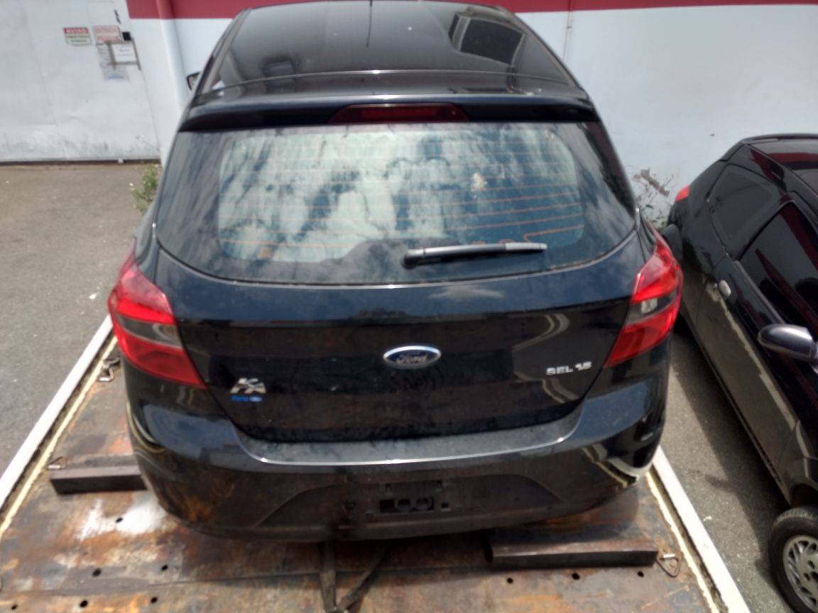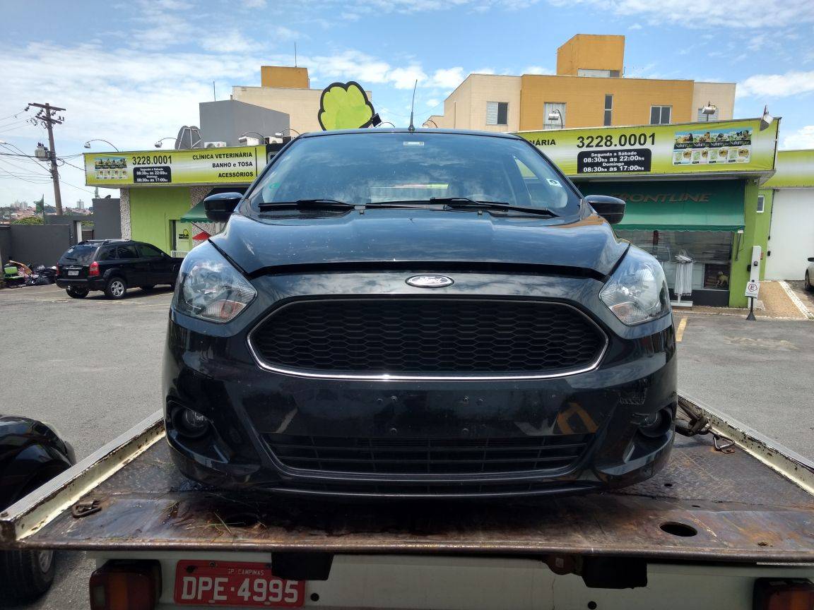 O veículo FORD/KA, ao realizar consulta via PRODESP do seu chassis, constou veículo produto de roubo na data de 21 de janeiro de 2018, conforme BOPC 486/2018, estando este sem os cinco pneus (incluso o pneu sobressalente), sem a bateria e os equipamentos obrigatórios.