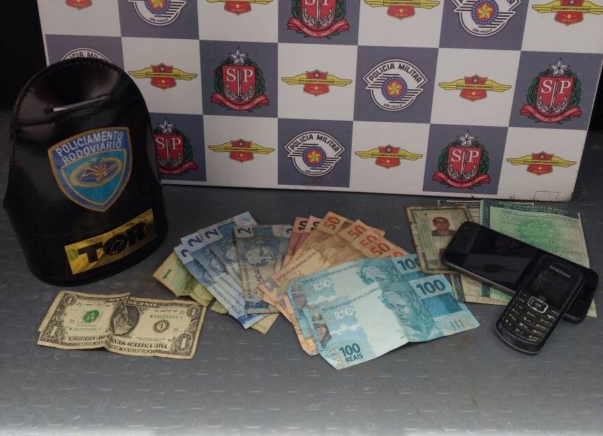 Realizada a busca pessoal, nada de ilícito foi encontrado, com a mulher, porém, no veículo foram encontrados dois aparelhos celulares, R$ 532,50 reais, além de um dólar em nota, um CRLV do FORD/ FIESTA, e um recibo de compra e venda de uma motocicleta 125 Honda. Todos estes pertences foram apreendidos pelo delegado de plantão e o veículo liberado para parte feminina.