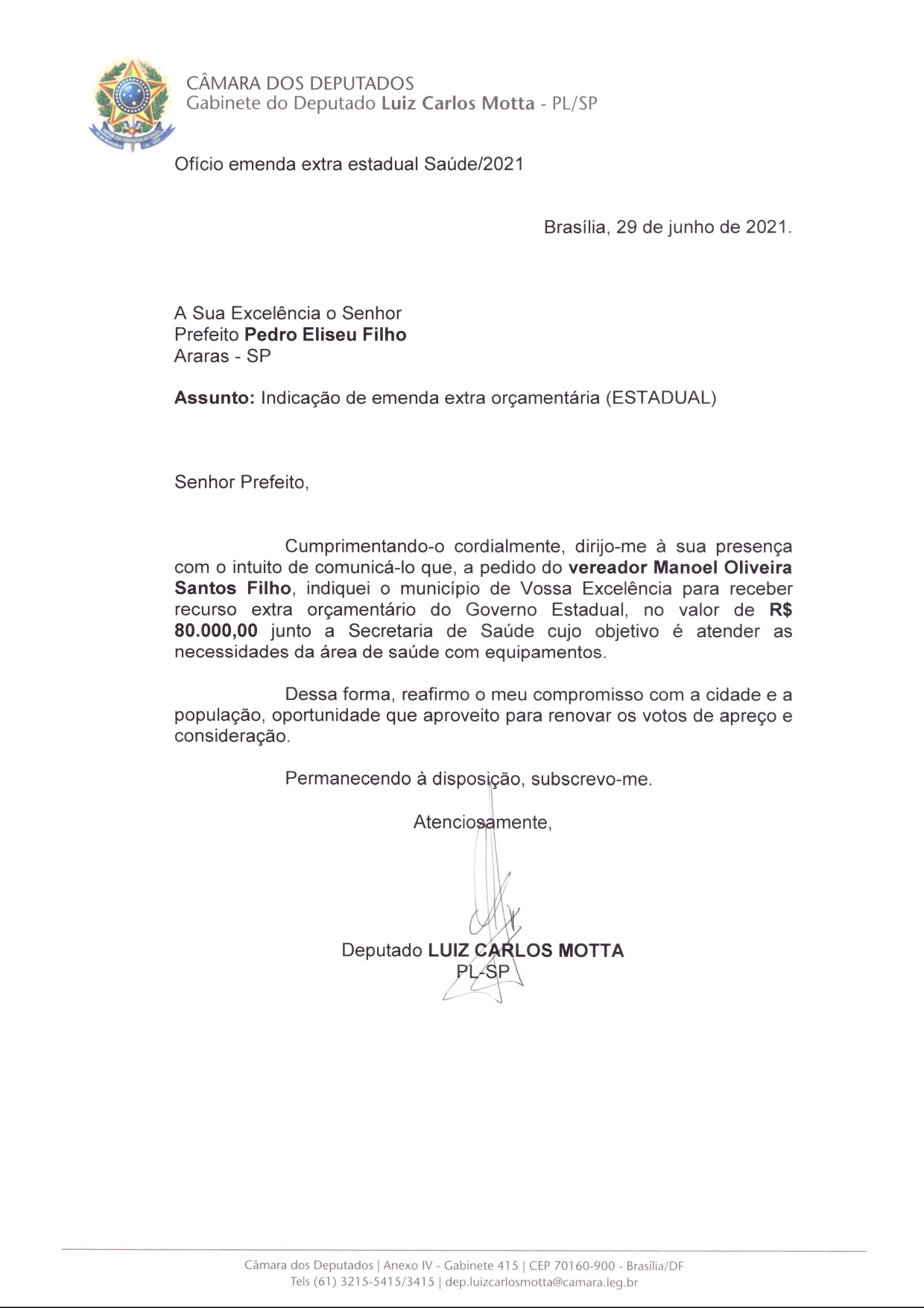 O vereador Mané da Rádio conseguiu através do Deputado Estadual Luiz Carlos Motta – PL, uma indicação para a Saúde de Araras (SP), através de uma Emenda Parlamentar.