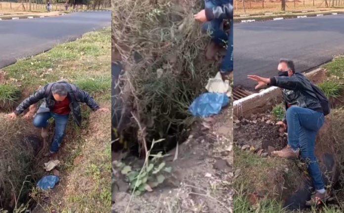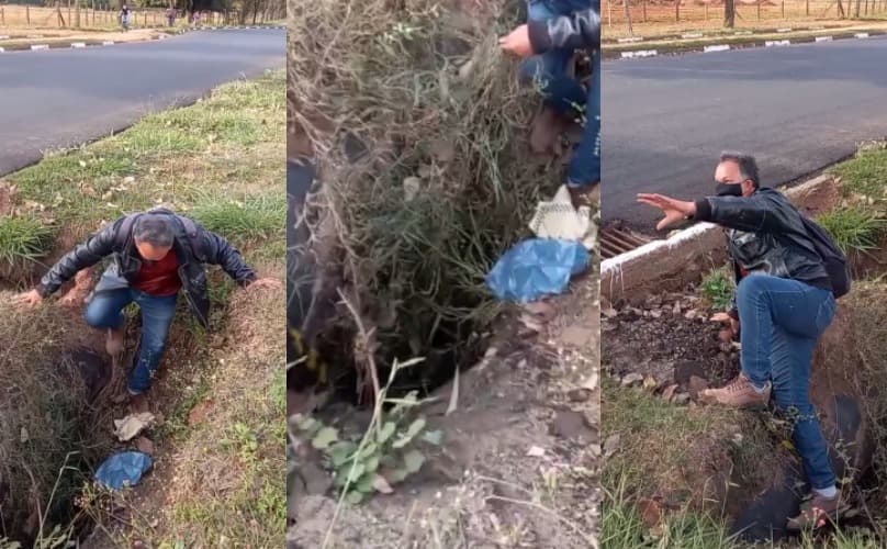 Na filmagem o vereador quase caí dentro do buraco. O cano passa por uma escavação na Avenida Milton Severino e demanda cuidados para que não cause um acidente. “Gente é o seguinte. O Sabaz passou o cano aqui. Olha que perigo, mosquito. Olha o que fizeram, água parada aqui embaixo. A água fluvial desce de lá, e passa por aqui e vai embora para o rio. Só que eles colocaram o cano da Sabaz e entupiu tudo aqui e deixou tudo entupido”, registrou o parlamentar.