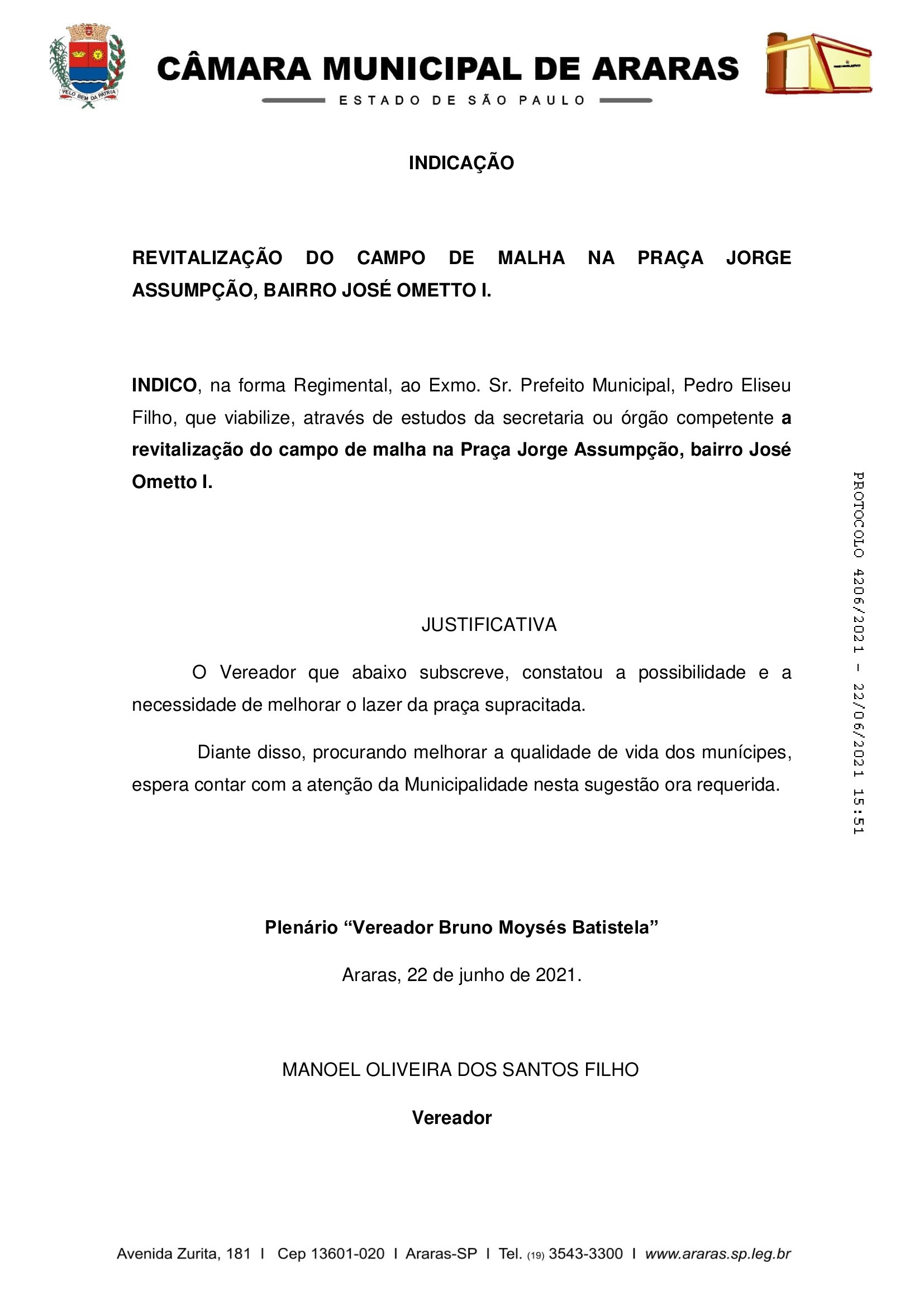 O vereador Manoel de Oliveira dos Santos Filho, o Mané da Rádio (PL), encaminhou uma indicação ao prefeito Pedrinho Eliseu (PSDB), para que ele viabilize, através de estudos da secretaria ou órgão competente a revitalização do campo de malha na Praça Jorge Assumpção, bairro José Ometto I, em Araras (SP).