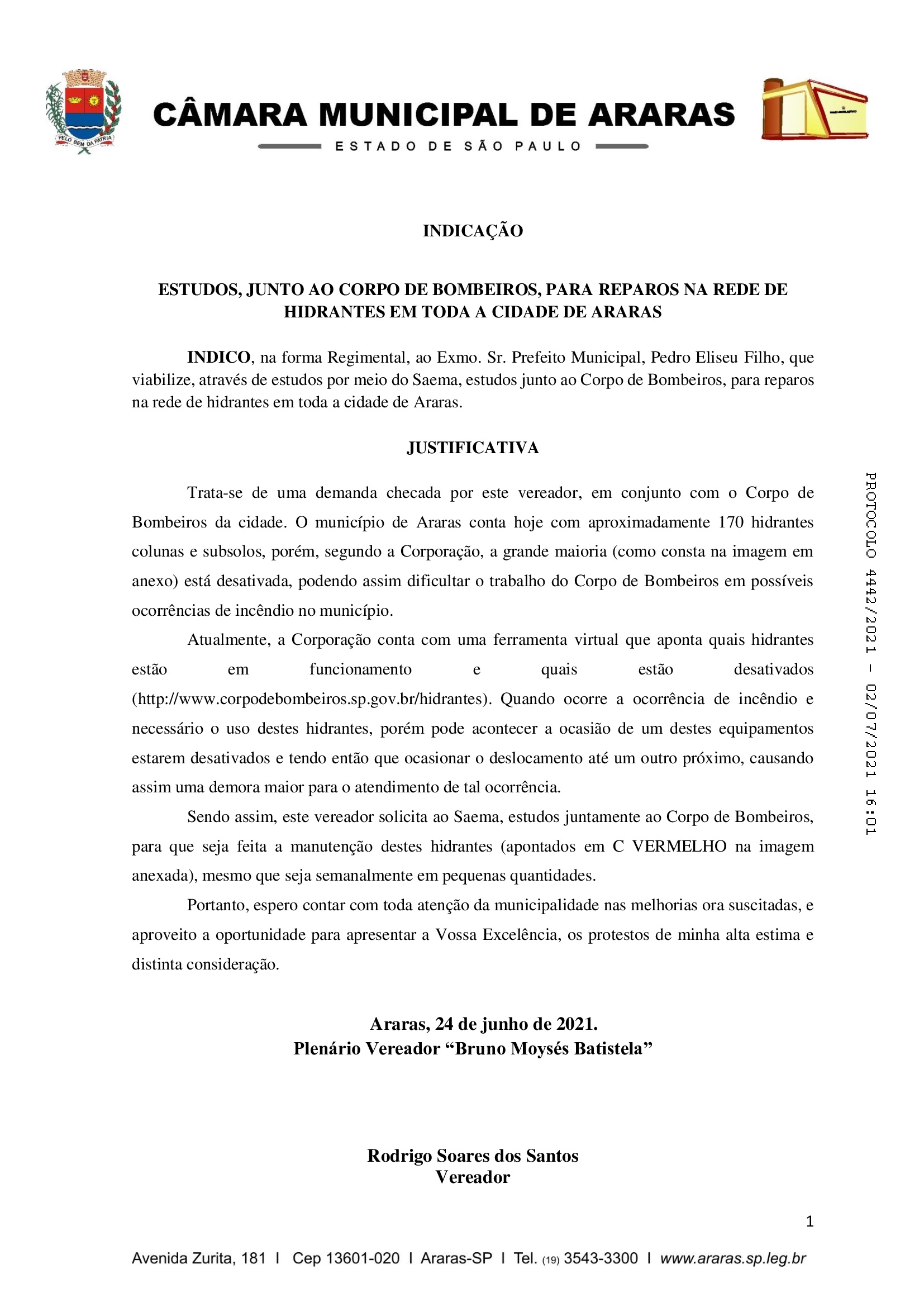 O vereador Rodrigo Soares (PSDB), enviou uma indicação quase no final do mês de junho ao prefeito Pedrinho Eliseu (PSDB), para que ele viabilize, através por meio do Saema, estudos junto ao Corpo de Bombeiros, para reparos na rede de hidrantes em toda a cidade de Araras.