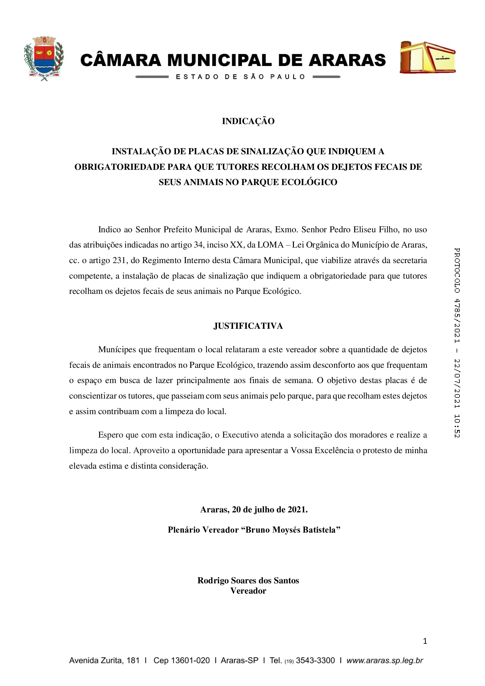 O vereador Rodrigo Soares (PSDB), encaminhou uma indicação ao prefeito Pedrinho Eliseu (PSDB), para que ele viabilize através da secretaria competente, a instalação de placas de sinalização que indiquem a obrigatoriedade para que tutores recolham os dejetos fecais de seus animais no Parque Ecológico, em Araras (SP).