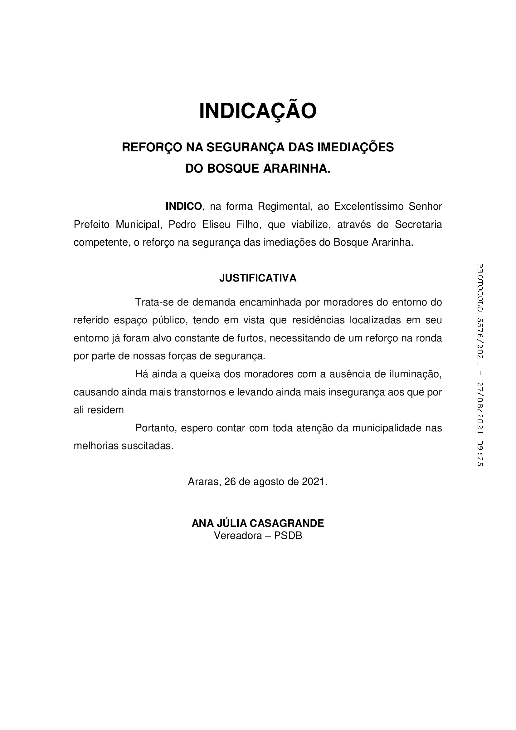 A vereadora Ana Júlia Casagrande, encaminhou uma indicação ao prefeito Pedrinho Eliseu, para que ele viabilize, através de Secretaria competente, o reforço na segurança das imediações do Bosque Ararinha, na região leste de Araras (SP).