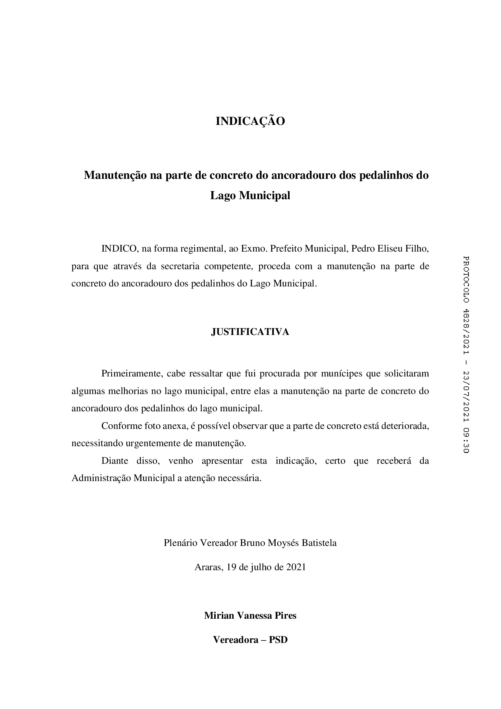 A vereadora Mirian Vanessa Pires (PSD), encaminhou uma indicação ao prefeito Pedrinho Eliseu (PSDB), para que através da secretaria competente, proceda com a manutenção na parte de concreto do ancoradouro dos pedalinhos do Lago Municipal, em Araras (SP).