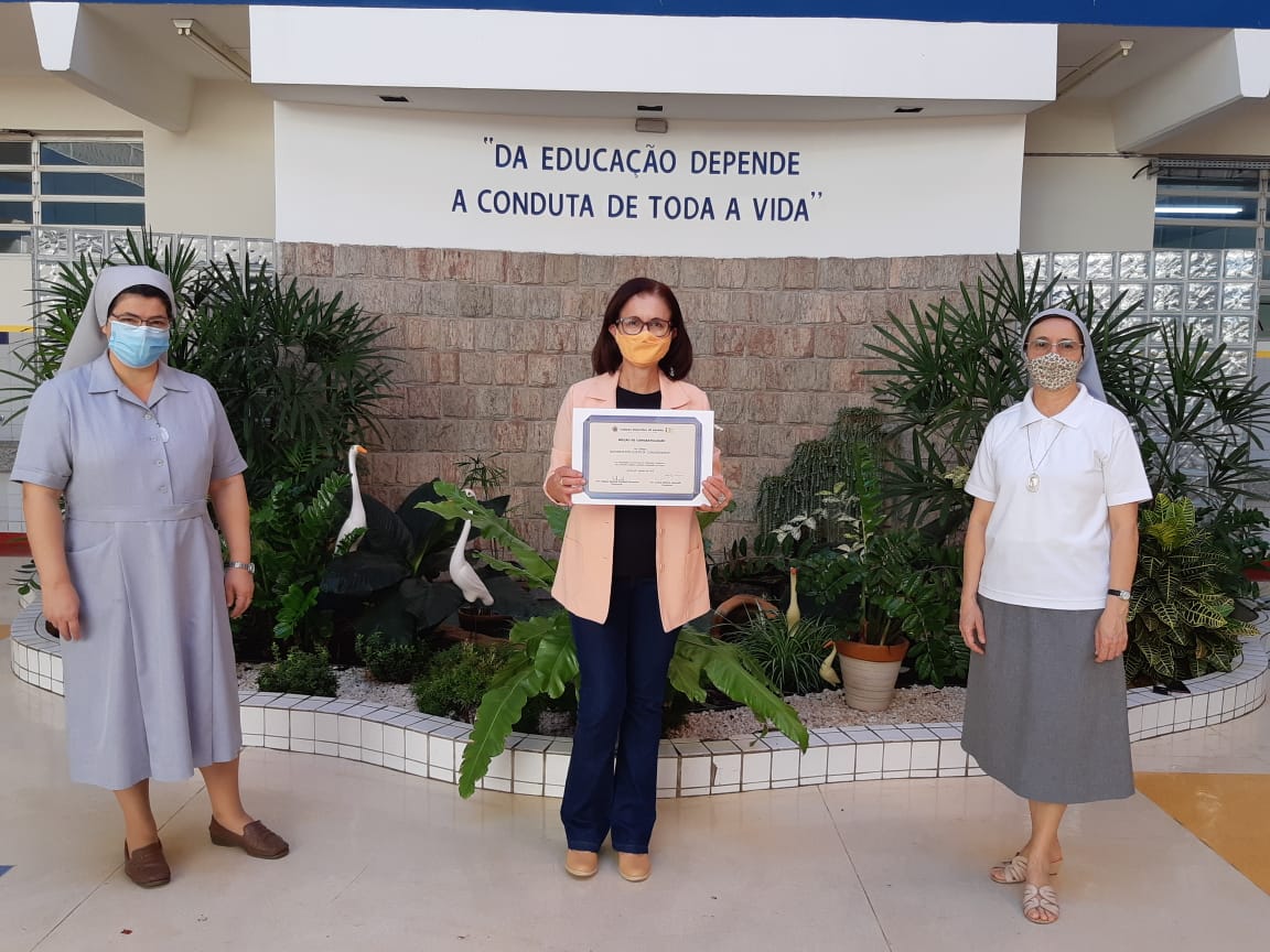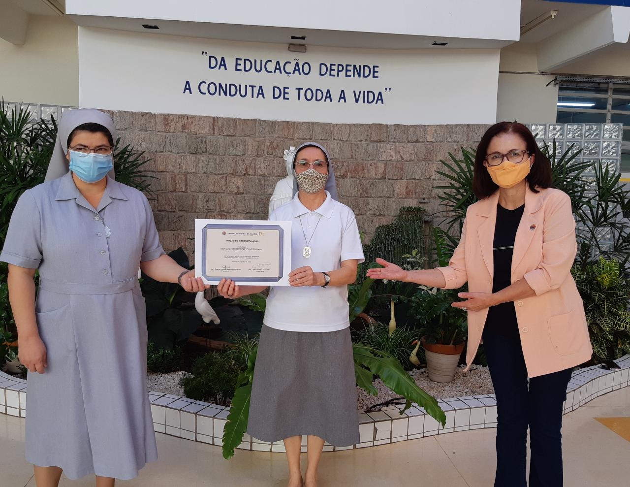 Na manhã desta quinta-feira (13) a vereadora Regina Corrochel, entregou à Diretora Administrativa da escola, Irmã Cidinha, juntamente com a Irmã Canossiana Verônica, a Moção de Congratulações em homenagem aos 60 anos do Colégio Canossianas.