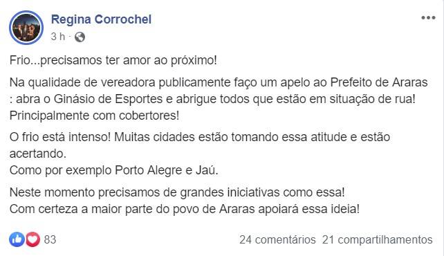 A vereadora Regina Corrochel passou o domingo (07) todo percorrendo as ruas de Araras em contato com os moradores de rua. Ela defende que o Ginásio de Esportes seja usado poi é mais amplo e abrigará mais pessoas do que o Centro POP.