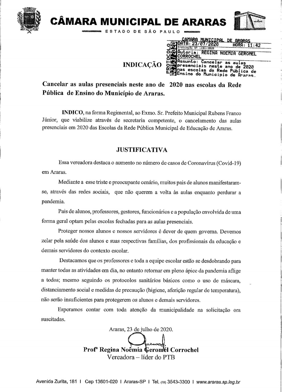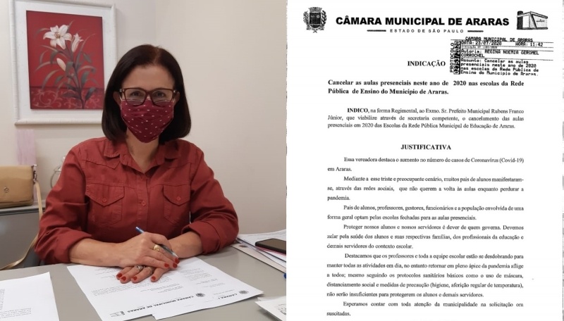 A vereadora e líder do PTB na Câmara Municipal professora Regina Corrochel protocolizou na manhã dessa quinta-feira (23) uma série de documentos visando o cancelamento das aulas presenciais neste ano de 2020 na Rede Municipal de Ensino em Araras (SP).